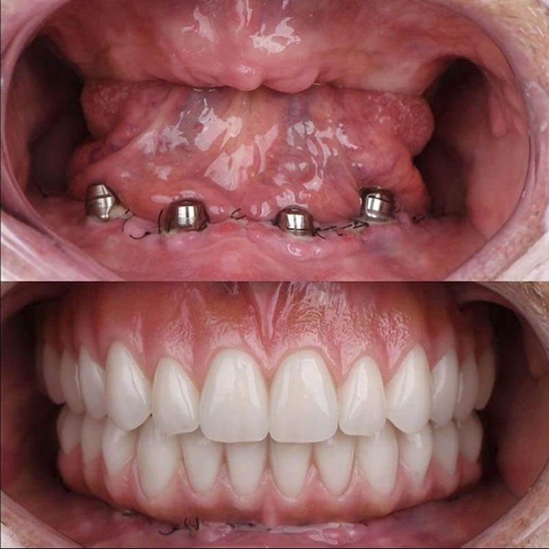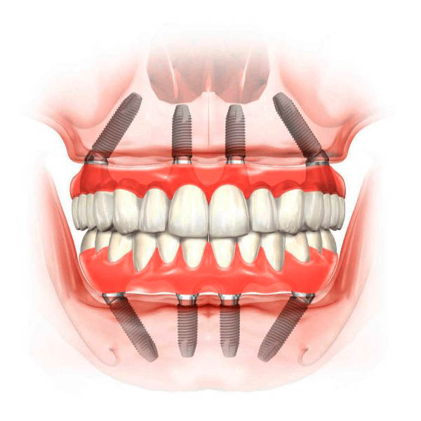 Устанавливается только четыре импланта в качестве опоры для полного несъемного протеза: два вживляются вертикально во фронтальный отдел и два под углом до 45° в дистальных отделах челюсти.