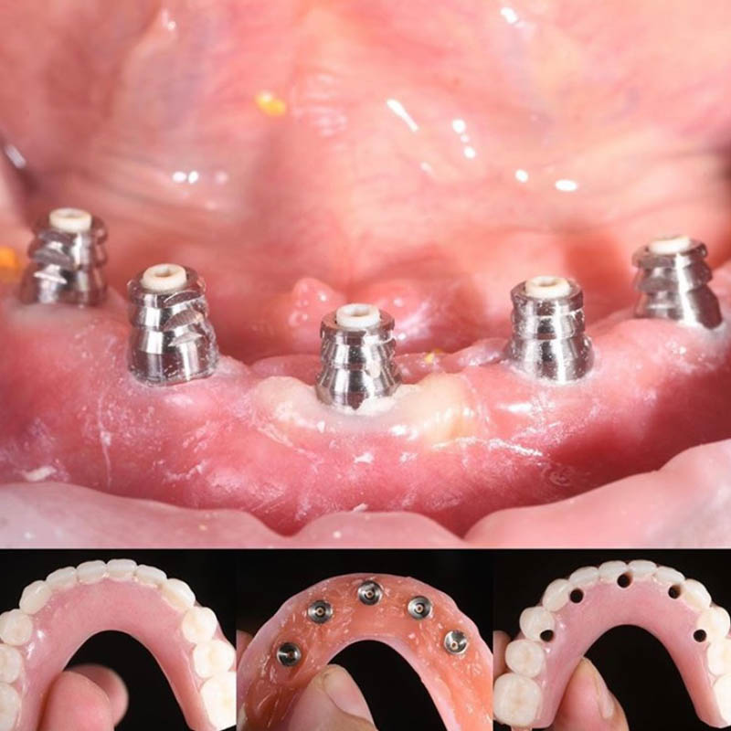 На имплантах крепится несъемный протез, имеющий акриловое основание (скрывает изъяны собственной слизистой), а также пластмассовые, керамокомпозитные или даже керамические, циркониевые коронки. Он в полной мере восстанавливает эстетику, края искусственной слизистой не заметны при улыбке.